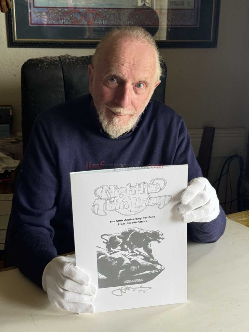 All are presented in a 22.86 x 30.48 cm, 9 x 12 inch thick white textured paper cover portfolio printed on the front, back, and inside. Each portfolio is signed and numbered on the front cover by Jim FitzPatrick.